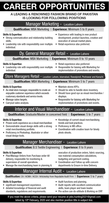 A leading Fashion Brand in Pakistan Career Opportunities exprience required and age limits requried