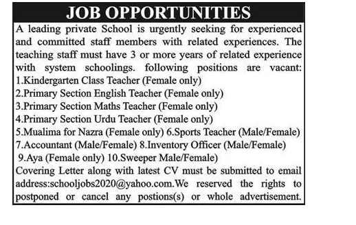 Jobs in A Leading Private School in Peshawar Staff Required