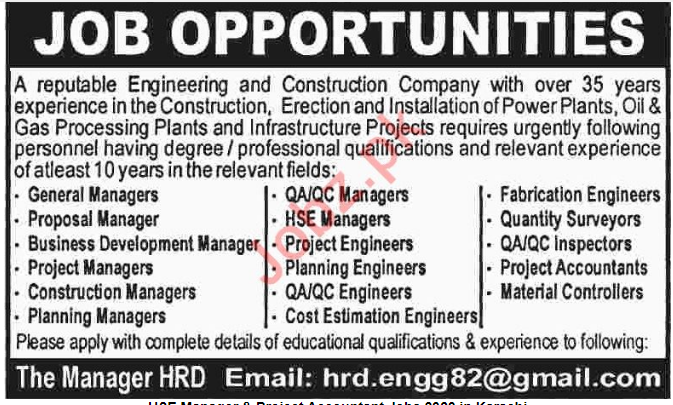 Jobs in A reputed Engineering and Construction Company Positions Vacant