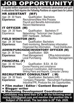 Jobs in A reputed welfare Organization Positions Vacant