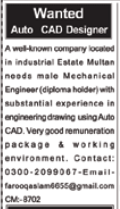 Job in A well known Company Multan Auto Cad Designer Required