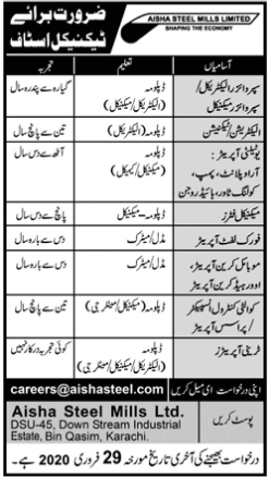 Aisha Steel Mills Ltd. Urgent Staff Required for Tecnical work