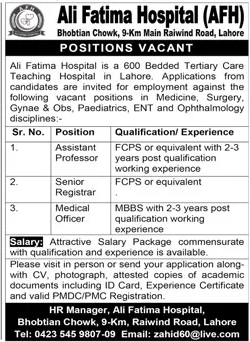 Jobs in Ali Fatima Hospital Lahore Positions Vacant