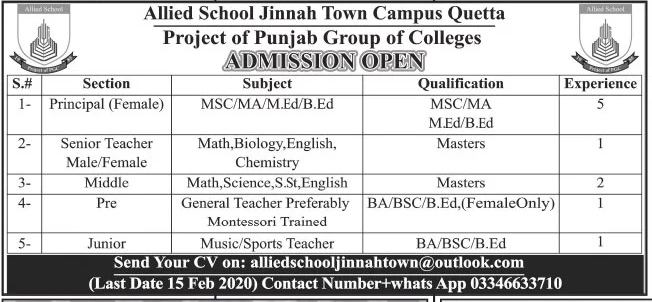 Jobs in Allied School Jinnah Town Campus Quetta Staff Required
