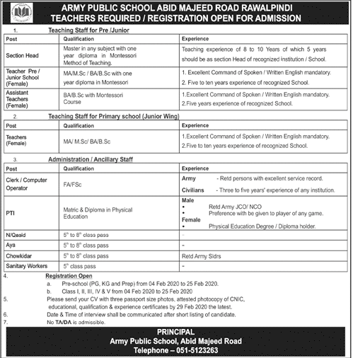 Jobs in Army Public School Abid Majeed Road Rawalpindi Positions Vacant