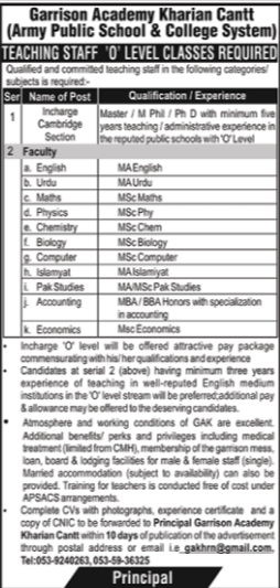 Jobs in Army Public School and College Kharian Positions Vacant