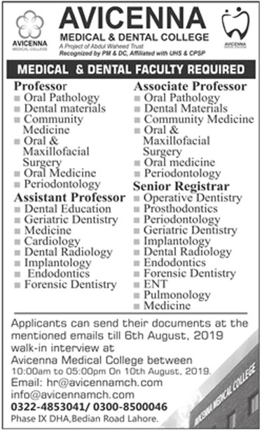 Avicenna Medical & Dental College Faculty Required in following Categories.