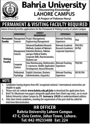 Bahira University Lahore Campus Permanent and Visiting Faculty Required