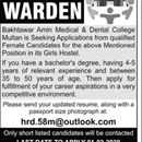 Bakhtawar Amin Medical and Dental College Hostal Warden Required