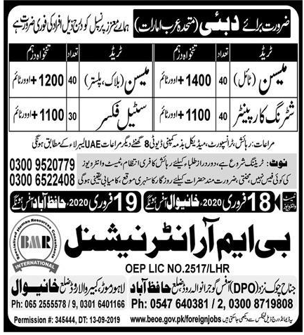 Jobs in BMR International Ltd Pvt Staff Required for Dubai