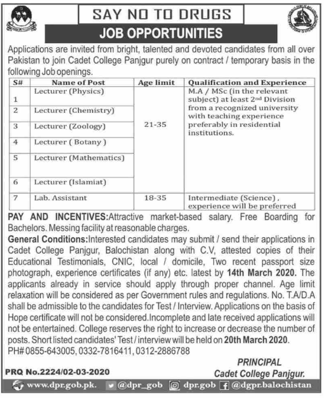 Jobs in Cadet College Panjgur , Balochistan Positions Vacant