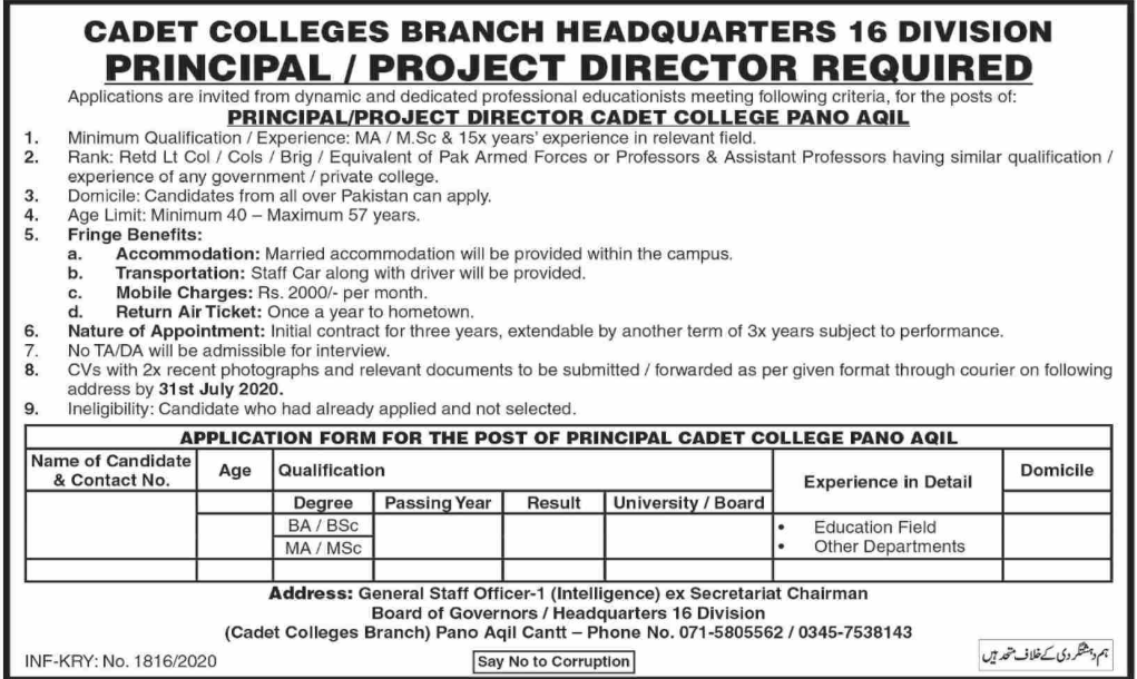 Jobs in Cadet College Panu Aqil Sindh Staff Required