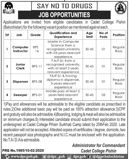 Jobs in Cadet College Pishin, Balochistan Positions Vacant