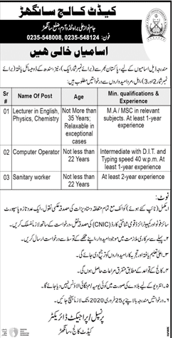 Cadet College Sanghar, Position Vacant for Teacher