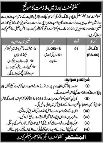 Jobs in Cantonment Board Jhelum Positions Vacant