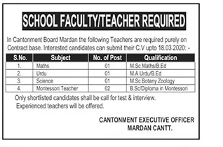 Jobs in Cantonment Board Model School Teaching Faculty Required