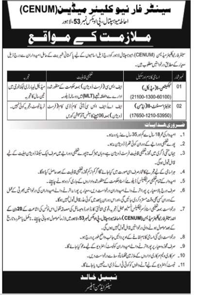 Jobs in Center for New Clear Medicine Mayo Hospital Lahore Career Opportunity