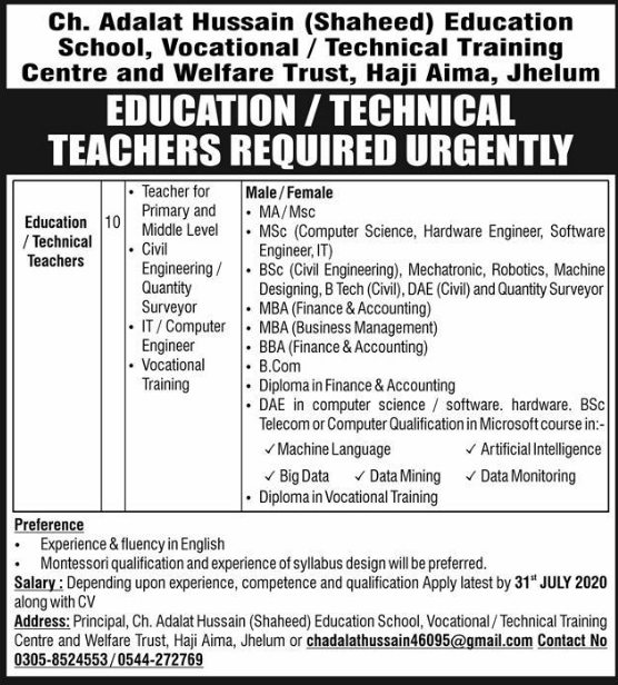 Jobs in Ch Adalat Hussain Education School Tecahers Required