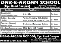 Job in Dar-E-Arqam School Tipu Road Campus Rawalpindi Staff Required
