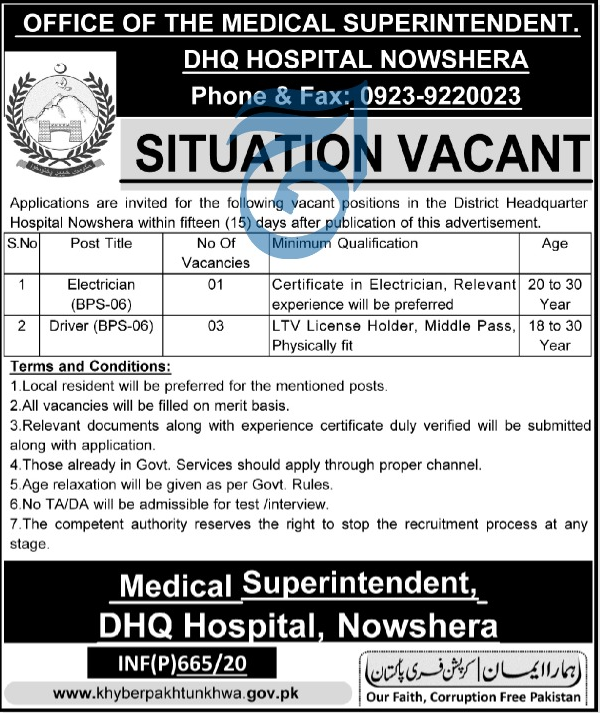 Jobs in DHQ Hospital, Nowshera Non Medical Staff Required