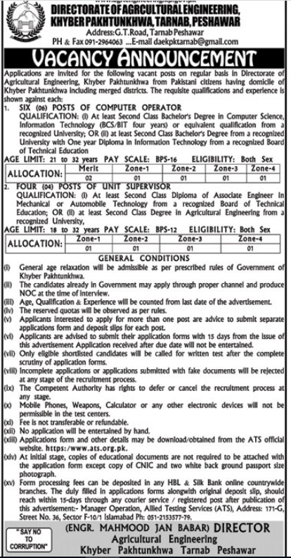 Directorate of Agriculture Engineering, KPK Vacancy Announcement