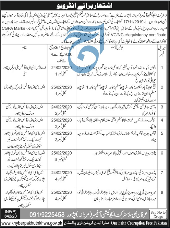 Jobs in District Education Officer Mardan Positions Vacant