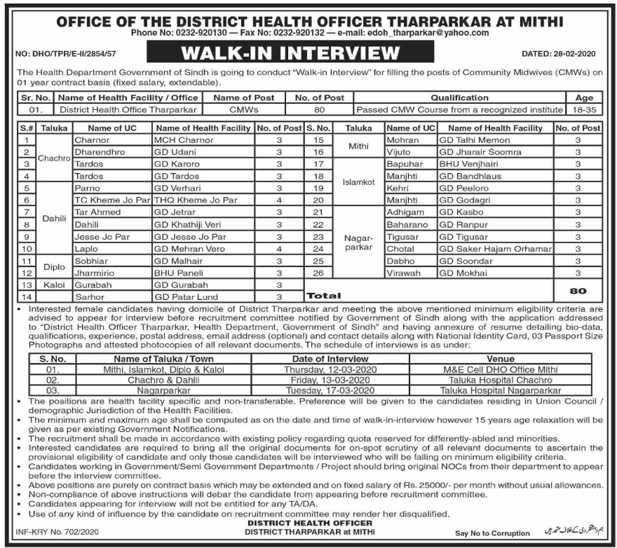 Jobs in District Health Office Tharparkar and Mithi Walk In Interview
