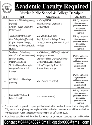 Jobs in District Public School and College Depalpur Positions Vacant