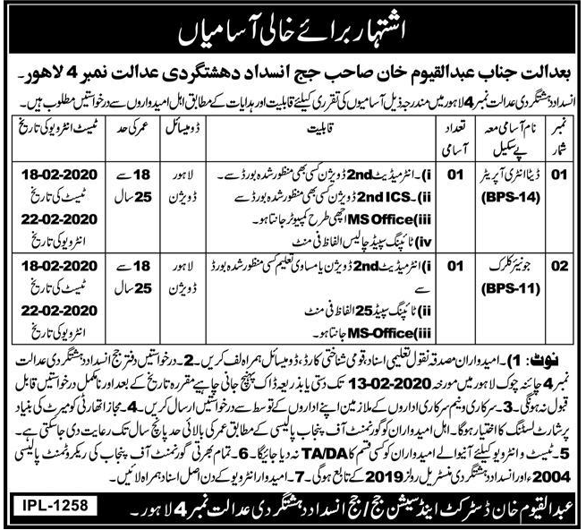 Jobs in District Sessions Court Lahore Positions Vacant