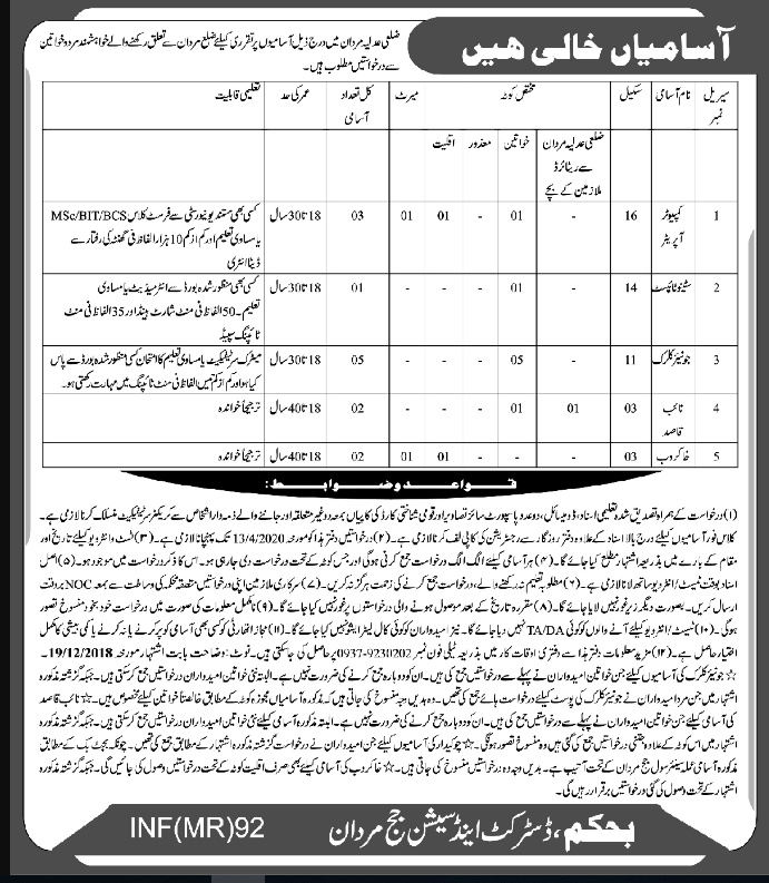 Jobs in District Sessions Court Mardan Positions Vacant