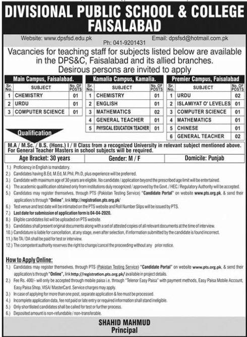 Jobs in Divisional Public School and College Positions Vacant