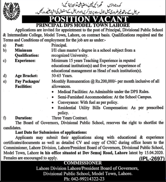 Job in Divisional Public School Model Town Lahore Principal Position Vacant