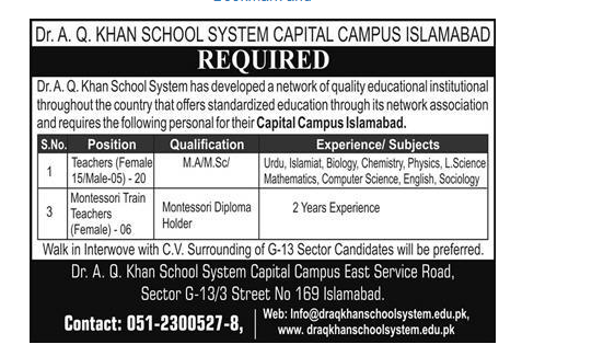 Jobs in Dr AQ Khan School Islamabad Campus Staff Required