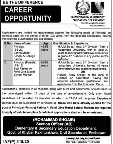 Elementary and Secondary Education Department principal required male and femal MA and MSC Age limit 45 to 55 male and 55 to 65 femail