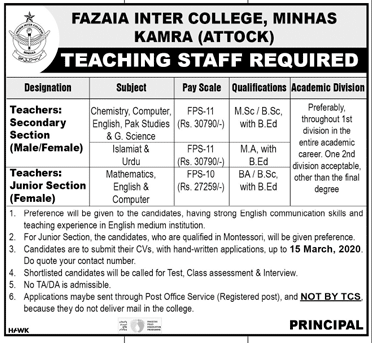 Jobs in Fazaia Inter College, Attock Teaching Staff Required