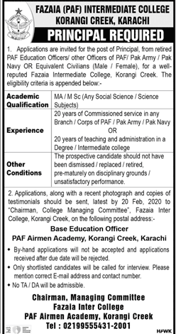 Job in Fazaia Inter College, Karachi Principal Required