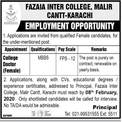 Fazaia Inter College, Malir Cantt Karachi Job Opportunity