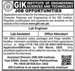Job in GIK Institute of Engineering Sciences and Technology Position Vacant