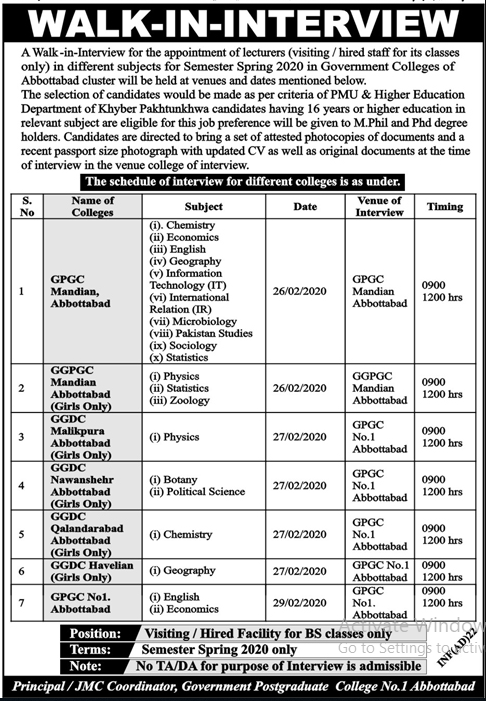 Jobs in Government Colleges of Abbottabad Positions Vacant