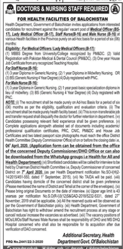 Jobs in Government of Balochistan Health Department Medical Staff Required