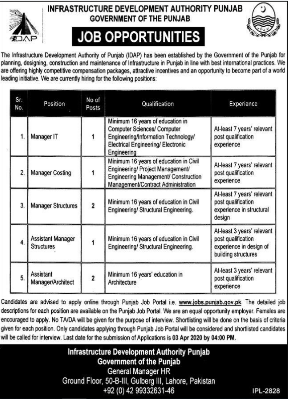 Jobs in Government of Punjab Infrastructure Development Authority Positions Vacant