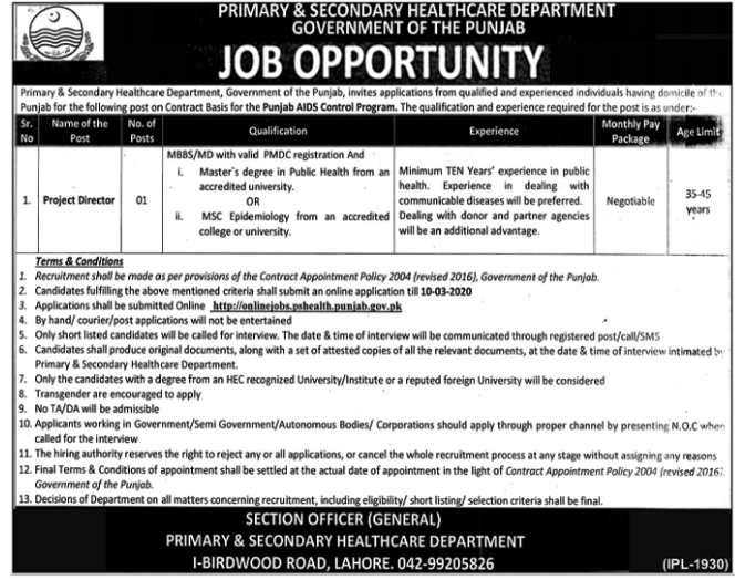 Job in Government of Punjab Primary and Secondary Healthcare Department Positions Vacant