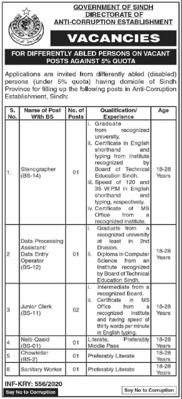 Jobs in Government of Sindh Directorate of Anti-Corruption Establishment Positions Vacant