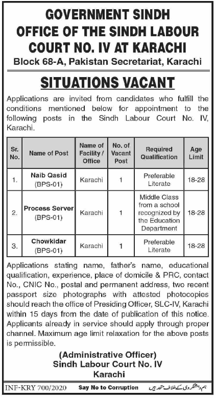 Jobs in Government of Sindh Office of Sindh Labor Court Situations Vacant