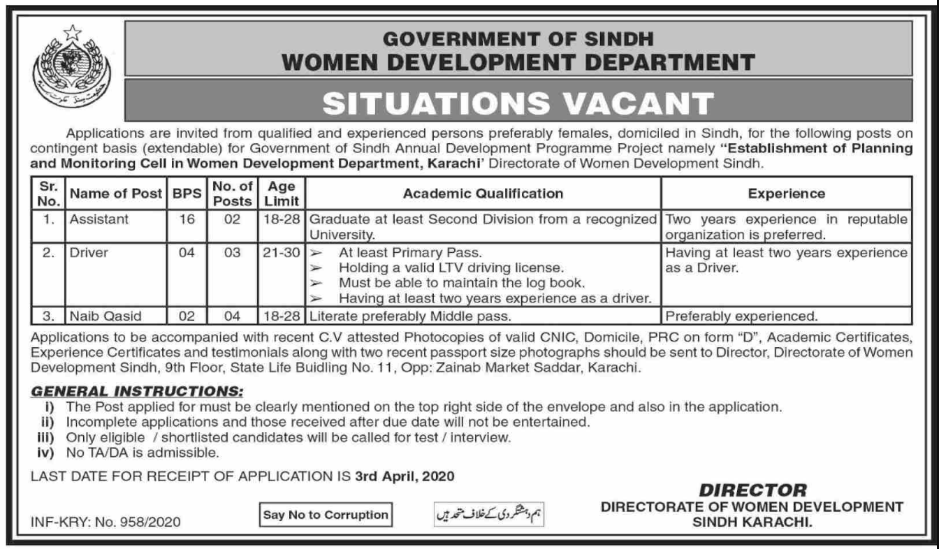 Jobs in Government of Sindh Women Development Department Situations Vacant