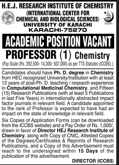 H.E.J Research Institute of Chemistry Position Vacant