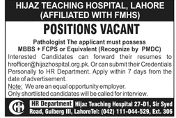 Hijaz Teaching Hospital, Lahore Position Vacant