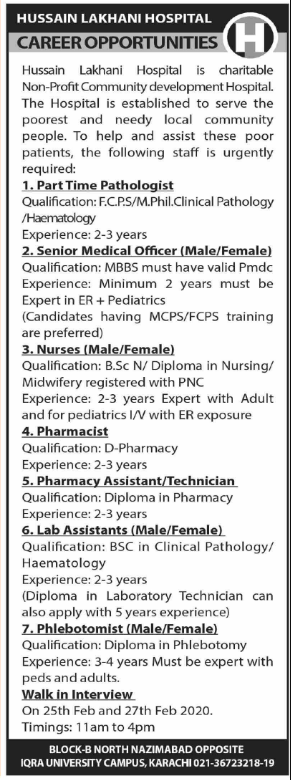 Jobs in Hussain Lakhani Hospital Karachi Career Opportunity