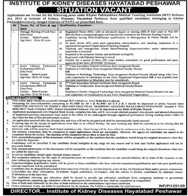 Jobs in Institute of Kidney Diseases Hayatabad Peshawar Situations Vacant