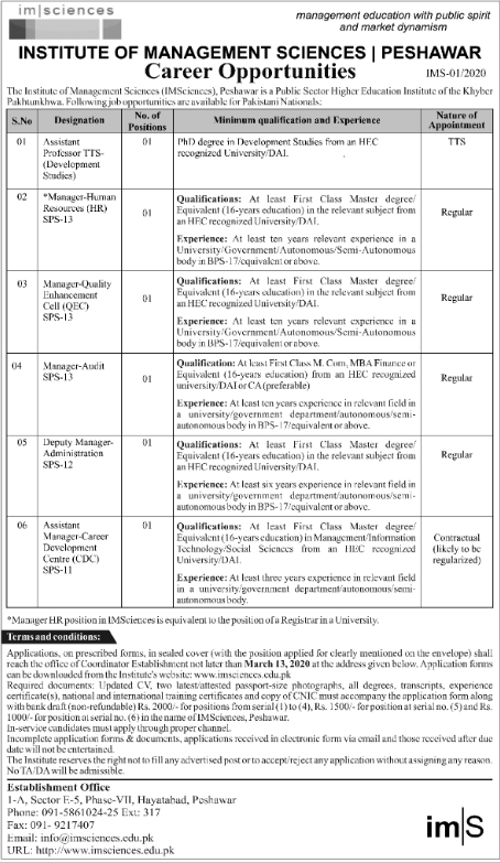 Jobs in Institute of Management Sciences Peshawar Positions Vacant